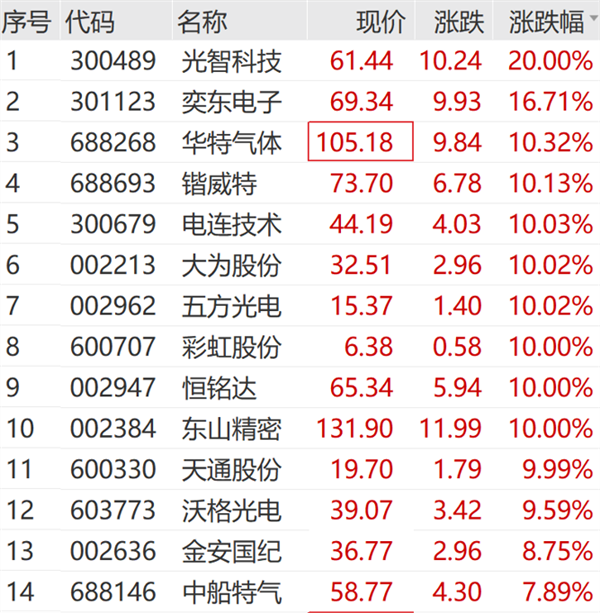 个股方面,光智科技走出20cm涨停,五方光电、彩虹股份、大为股份等纷纷涨停,奕东电子、锴威特等涨超10%。