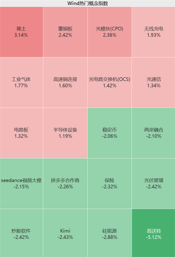 盘面上,电子、通信板块逆市猛拉,稀土、覆铜板、光模块等方向活跃;传媒、非银金融、大消费等板块集体不振,光伏概念股重挫。