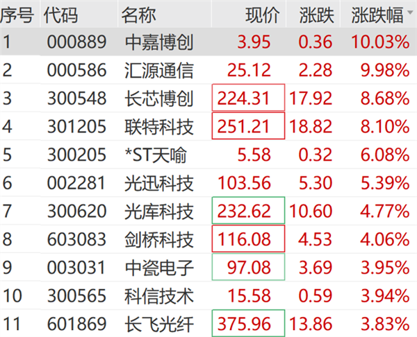 通信板块盘中走强,中嘉博创、汇源通信涨停。光模块概念股火热,长芯博创、联特科技、光迅科技、剑桥科技等大涨。