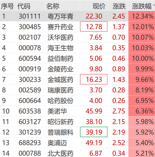 个股方面,益佰制药、金陵药业、沃华医药、海王生物等涨停,粤万年青、赛升药业涨超12%,金城医药等跟涨。