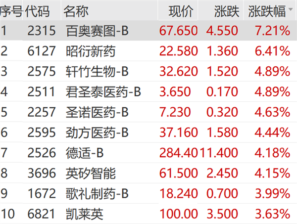 港股医药板块同步走强,昭衍新药、英矽智能、康龙化成等涨幅居前。
