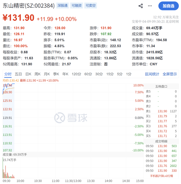 东山精密再度涨停,报131.9元/股,总市值达到2416亿元。