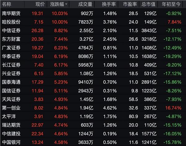 早盘大金融板块走高,券商股集体拉升,南华期货、哈投股份涨停,中信证券涨超7%,东方财富、广发证券、华泰证券等均涨超5%。