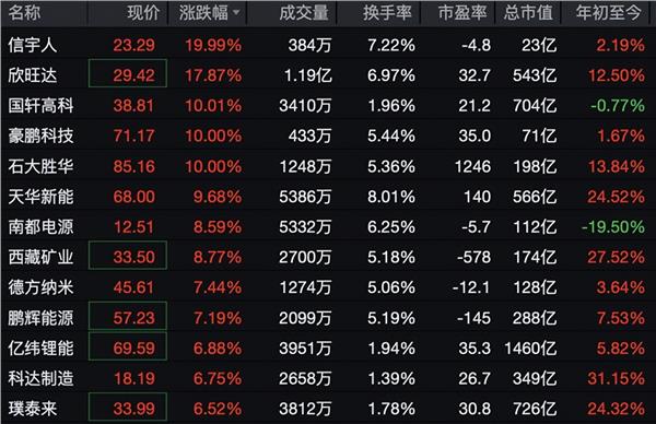 锂电池产业链震荡拉升,信宇人20%涨停,国轩高科、豪鹏科技、石大胜华等多股涨停,亿纬锂能一度大涨超8%。