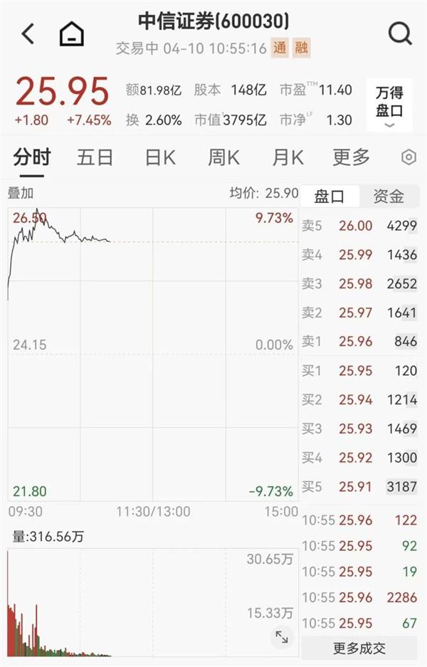 消息面上,4月9日,中信证券发布2026年第一季度业绩快报,公司实现营业收入231.55亿元,同比增加40.91%;归属于母公司股东的净利润为102.16亿元,同比增加54.6%;基本每股收益为0.67元。