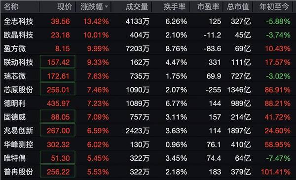半导体板块表现活跃,存储芯片概念股快速拉升,全志科技涨超13%,欧晶科技、盈方微纷纷涨停。