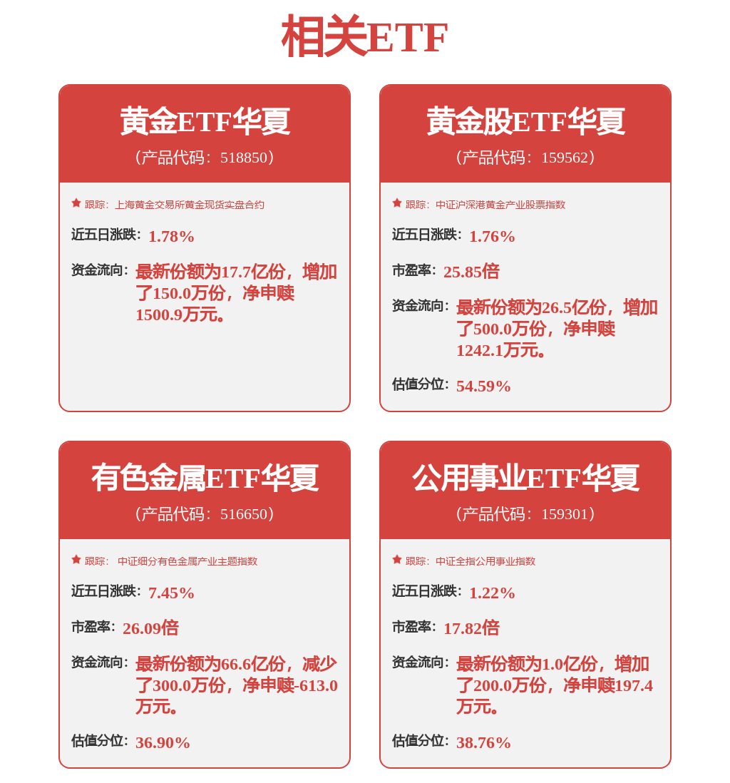 有色金属ETF华夏(516650)跟踪中证细分有色金属产业主题指数,聚焦黄金及铜铝等工业金属、稀土与钨钼等小金属,以及锂钴等能源金属,其金铜铝含量合计59.67%,为全市场最高的ETF!
