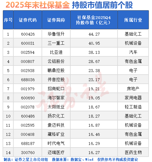从持股量角度看,招商蛇口、三一重工、兴业证券等10股的社保基金持股量均超过1亿股;2025年四季度末持股市值超10亿元的个股有30只,包括华鲁恒升、三一重工、比亚迪等。