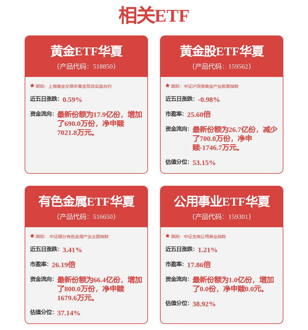 黄金ETF华夏(518850,联接008701/008702)属于商品型基金,主要投向国内黄金市场,其净值随国内黄金现货价格波动。因其价格与通胀水平相关性较高,黄金通常被作为抗通胀资产。此外,黄金长期收益与股票、债券等传统资产相关性较低,适合纳入资产配置,可有效优化组合的风险收益特征。