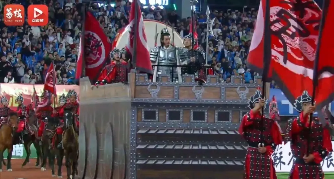 当何润东身穿战甲,乘战车出场,骏马绕场,战鼓擂动,战旗飘扬。何润东扮演的项羽大喊:“我项羽回来啦!宿迁队在哪里?南京队在哪里?”场上球迷齐声大喊:“在这里!在这里!”