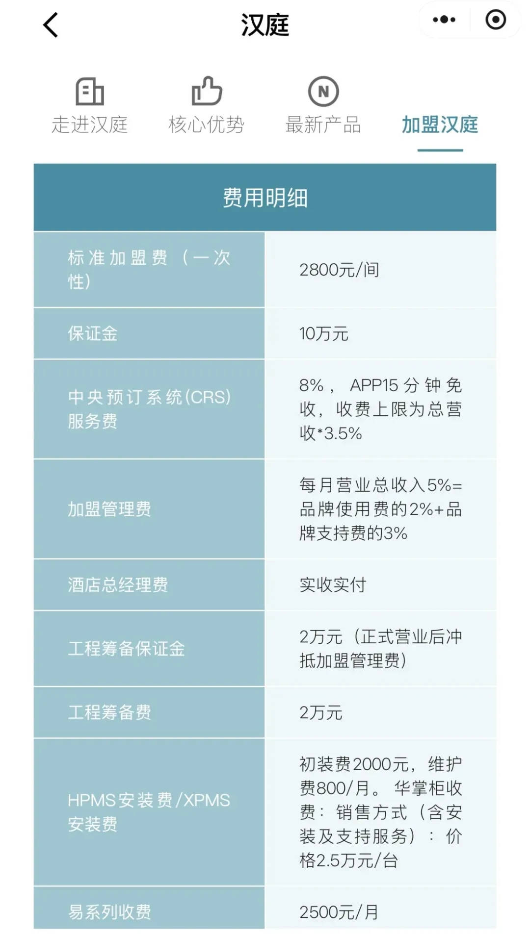 首次特许经营费方面,据《财中社》报道,以加盟一家全季酒店为例,首次特许经营费标准为2800元/间(客房数量不少于80间),这意味着一次性加盟费不低于20万元;开业之后,华住每月还要从加盟商的总营收中抽走5%作为管理费,其中包含2%的品牌使用费和3%的品牌支持费。