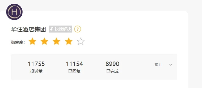 随着华住旗下酒店数量的激增,门店品控管理的压力愈发凸显。截至4月20日,黑猫投诉平台上,华住酒店集团的累计投诉量已超11000条,投诉内容涵盖卫生脏乱、服务敷衍、退款难、隐私泄露等多个方面。