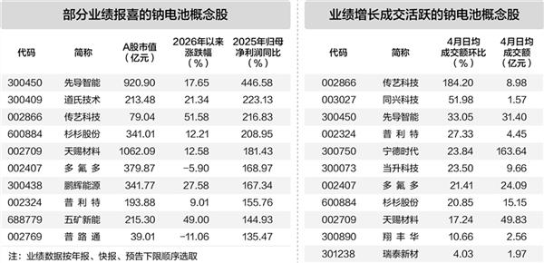 据证券时报・数据宝统计,A股钠电池概念股中,2025年归母净利润为正值且同比增长(业绩按年报、快报、预告下限顺序选取,含扭亏为盈)的共有24只。其中7只概念股实现归母净利润扭亏为盈,分别为五矿新能、杉杉股份、多氟多、鹏辉能源、普路通、金银河、传艺科技。
