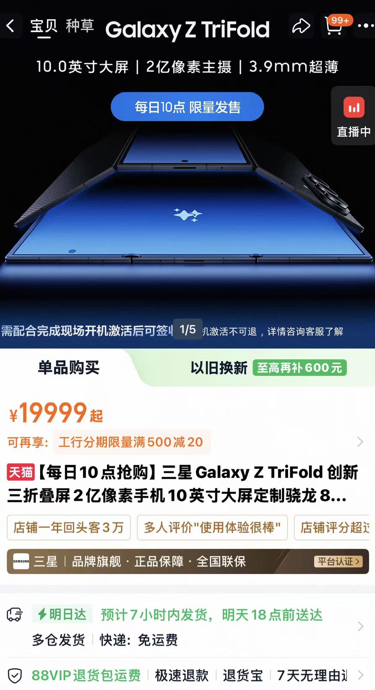 最近,杭州市民吴先生遇到了一个麻烦事,他在某平台的三星官方旗舰店上下单了一台三星三折叠手机,三星Galaxy Z TriFold的1TB款,售价21999元,他直接付款。