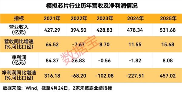 根据申万三级模拟芯片设计行业的35家公司来看,2025年,33家公司(仅2家尚未披露业绩指标)2025年实现营收近532亿元,按可比口径统计,同比增长15.68%,营收规模创2021年以来最高水平,营收同比增速创2022年以来新高;实现净利润8.08亿元,扭转过去2年亏损的局面,同比增长457.02%,净利润增速创2021年以来新高。