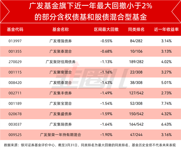 今年3月,权益市场波动加大,不少含权品种出现回撤,而广发基金旗下仍有不少股债混合型基金将最大回撤控制在2%以内。
