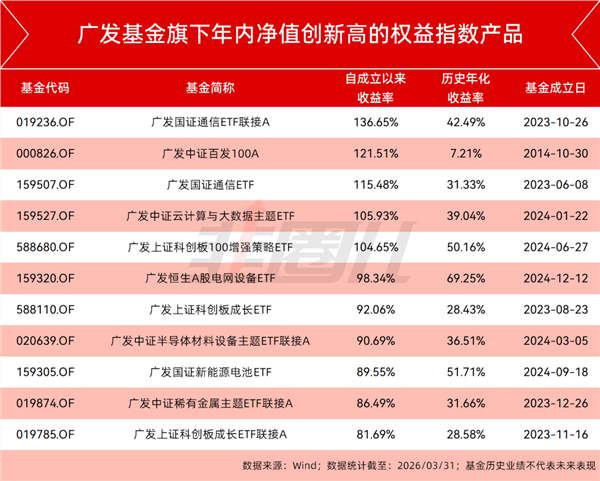 比如广发制造业精选A,成立以来收益率596.74%,历史年化收益率14.28%;广发多因子A,成立以来收益率437.46%,历史年化收益率19.92%;广发电子信息传媒股票A,成立以来收益率254.87%,历史年化收益率16.47%。(数据来源:Wind、基金定期报告,截至2026.3.31)