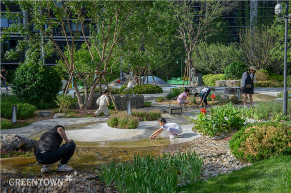在北京沁园,项目以“山林河谷”为设计理念,打造了“常流水戏水区+雨天旱溪”双系统。下雨时,旱溪变身雨水汇流通道,让水慢慢渗进地下;天晴时,溪石错落、草木葱茏,成为孩子的自然探索场。小朋友在踩水玩耍间,便能读懂水循环的奥秘。