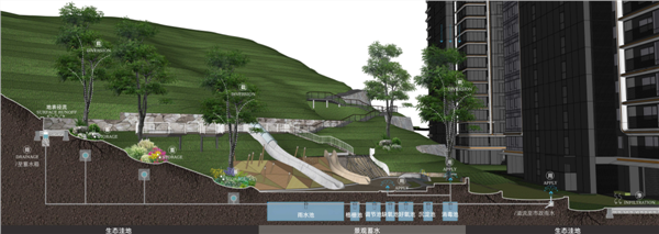 长沙凤起麓鸣构建了“智慧山体海绵”系统,实现山体径流的自循环灌溉。雨水经由生态截流沟与雨水花园层层净化,最终汇入蓄滞池,反哺花木浇灌。该系统可节省大量绿化灌溉用水,使“海绵体质”成为园区的生态底色。