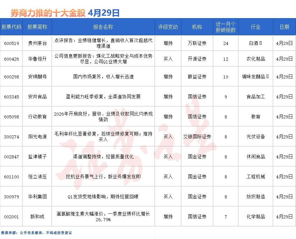 贵州茅台最受券商关注,近一个月获开源证券、山西证券、中邮证券、西南证券、群益证券、中银证券、国信证券、信达证券、东吴证券等21份券商研报关注,位居4月29日券商力推股榜首。